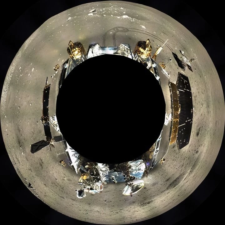 这是嫦娥三号地形地貌相机拍摄的着陆器周边360°范围的全景镶嵌影像图,采用方位投影方式表达(2013年12月17日至12月18日摄)。新华社发