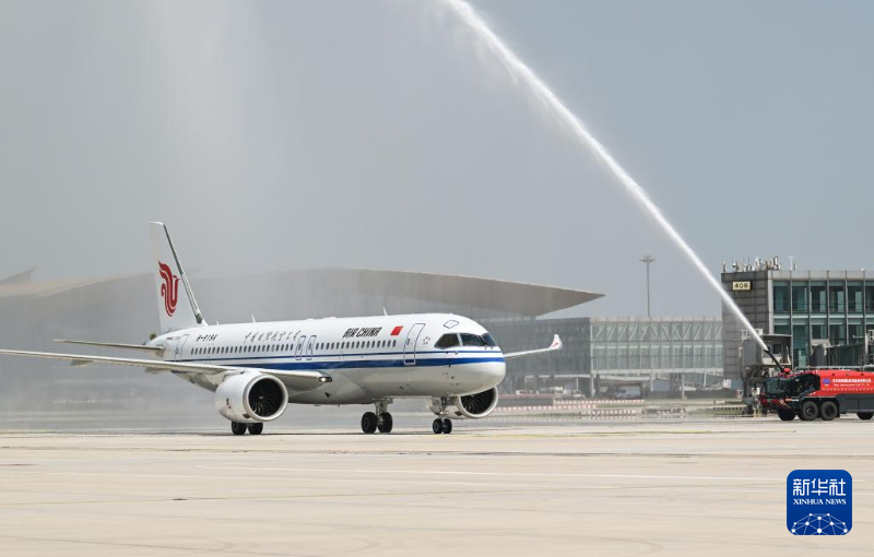 8月29日,国航首架C919国产大飞机降落北京首都国际机场后缓缓滑行穿过“水门”。图片来源:新华社
