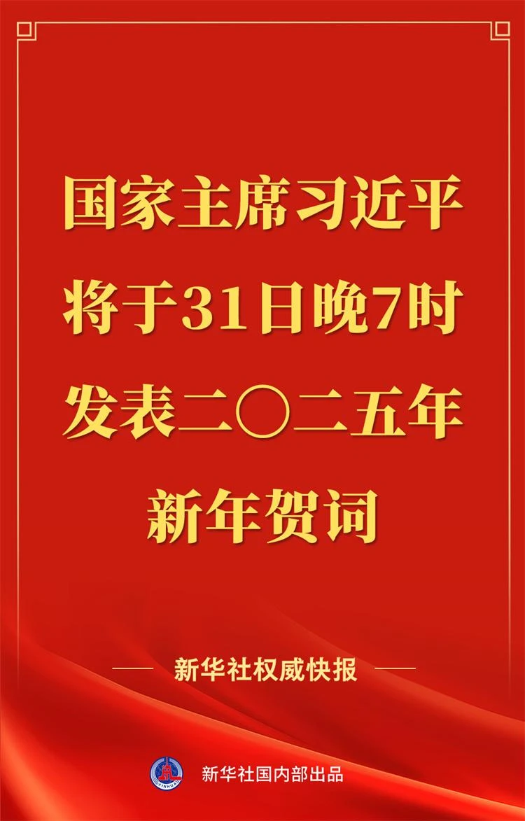 国家主席习近平将于31日晚7时通过中央广播电视总台和互联网,发表二〇二五年新年贺词。中央广播电视总台所属中央电视台综合频道、新闻频道、中文国际频道、4K频道,中国国际电视台各外语频道,中央人民广播电台,中国国际广播电台,以及人民网、新华网、央视新闻客户端等中央主要新闻媒体所属网站、新媒体平台将准时播出。