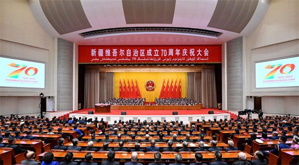 9月25日上午,新疆维吾尔自治区成立70周年庆祝大会在新疆人民会堂隆重举行。中共中央总书记、国家主席、中央军委主席习近平出席庆祝大会。新华社记者 燕雁 摄