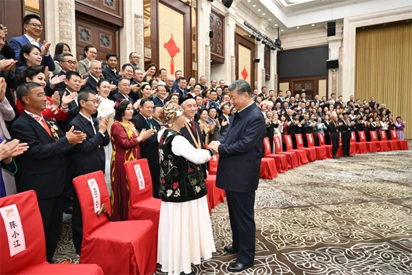 9月23日下午,中共中央总书记、国家主席、中央军委主席习近平在乌鲁木齐亲切接见新疆各族各界代表。这是习近平同代表亲切交流。新华社记者 谢环驰 摄