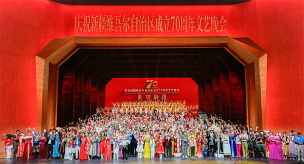 9月24日晚,庆祝新疆维吾尔自治区成立70周年文艺晚会《美丽新疆》在乌鲁木齐文化中心大剧院举行。新华社记者 申宏 摄