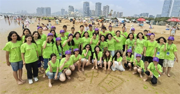 新疆青少年在青岛沙滩上写下“爱中国”。
