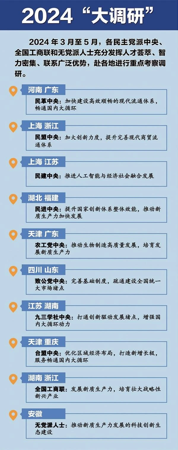 各民主党派中央、全国工商联和无党派人士紧紧围绕党和国家中心工作,积极参政议政、建言献策,为党和国家科学决策、民主决策提供重要参考。图为2024年3月至5月,各民主党派中央、全国工商联和无党派人士聚焦“发展新质生产力”和“畅通国内大循环”分赴各地开展实地调研情况。 中央统战部供图