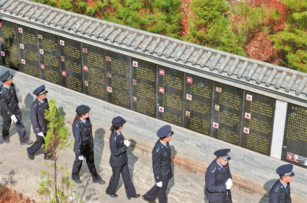 晋宁公安分局民警瞻仰烈士纪念墙。记者 胡妤雅 摄