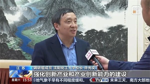 调研组成员 沈阳化工大学校长 许光文:强化创新产业和产业创新能力的建设,一方面强化龙头企业,要建自己的研发体。针对小型行业,希望能够(形成)行业的共同体,就是好多企业联合起来跟那些科研院所合作,建成面向产业的研发体,在实现技术创新、科技创新成果转化方面和产业化应用方面发挥主导作用。
