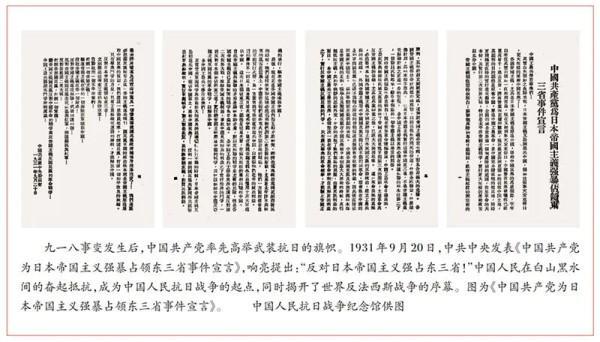 中国共产党自成立之日起就把实现中华民族伟大复兴作为自己的历史使命,捍卫民族独立最坚定、维护民族利益最坚决、反抗外来侵略最勇敢。在争取民族解放的伟大斗争中,中国共产党始终从政治上把握方向、大势、全局,为全民族抗战胜利发挥了不可替代的重要引领作用。面对穷凶极恶的日本军国主义侵略者,我们党在民族危亡的历史关头率先高举武装抗日旗帜?;诙哉涡问频目蒲Х治觯鞒隽巳毡镜酃饕逋谢褡宓拿苌仙饕艿闹卮笈卸?。纵观抗战全过程,无论是领导东北抗日联军顽强抵抗,还是广泛开展抗日救亡运动,无论是倡导建立抗日民族统一战线,还是确立全面抗战路线,我们党始终勇立潮头挺膺担当,以强有力的政治领导推动形成了全民族抗战的历史洪流。以毛泽东同志为主要代表的中国共产党人,在推进马克思主义中国化的进程中,把指导抗战实践作为理论创新的重要源泉,以深远的战略眼光和高超的政治智慧确立了党在抗战时期的方针、任务和政策,为抗战胜利提供了科学指引。