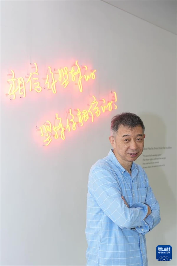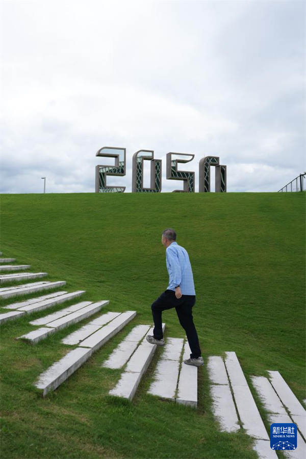 王坚在杭州云栖小镇的一处“2050”装置前留影(7月31日摄)。