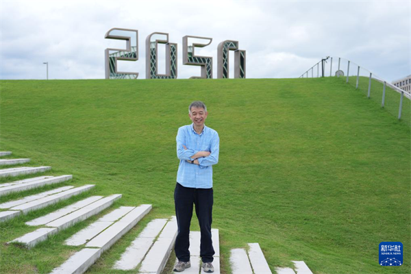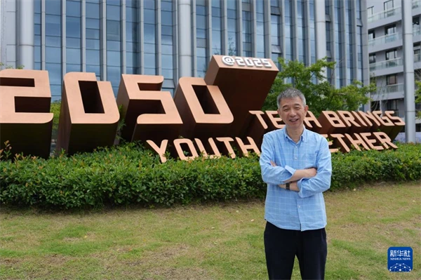 王坚在杭州云栖小镇“2050博悟馆”前留影(7月31日摄)。