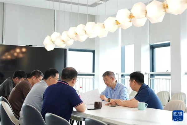 王坚(右二)在杭州云栖小镇与合作伙伴讨论人工智能科技创新和产业创新(7月31日摄)。