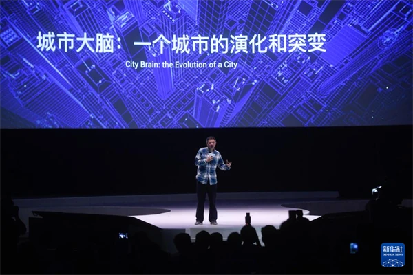 王坚在2018杭州·云栖大会上发表主旨演讲(2018年9月19日摄)。