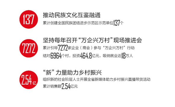 汇聚资源力量,助力乡村振兴与民生改善。支持各民主党派省委会开展会泽“同心工程”,协调投入物资资金1.2亿元。每年发布云南省民营企业社会责任报告,坚持每年召开全省“万企兴万村”现场推进会,累计引导7272家企业(商会)参与“万企兴万村”行动,结对6964个村,投资464.8亿元,吸纳就业近18万人,捐赠6.4亿元。举办“云品入沪(入闽)”推介活动,助销脱贫地区农产品累计10余亿元。推进“百城千校万企”促就业行动,每年引导约1500家民企参与活动,每年提供就业信息2万余条。云南省光彩事业基金会收到捐款4330余万元,支持项目96个,共计4747万元,有力助推社会事业发展。组织新的社会阶层人士开展全省新媒体助力乡村振兴直播带货活动,累计销售额2.54亿元。
