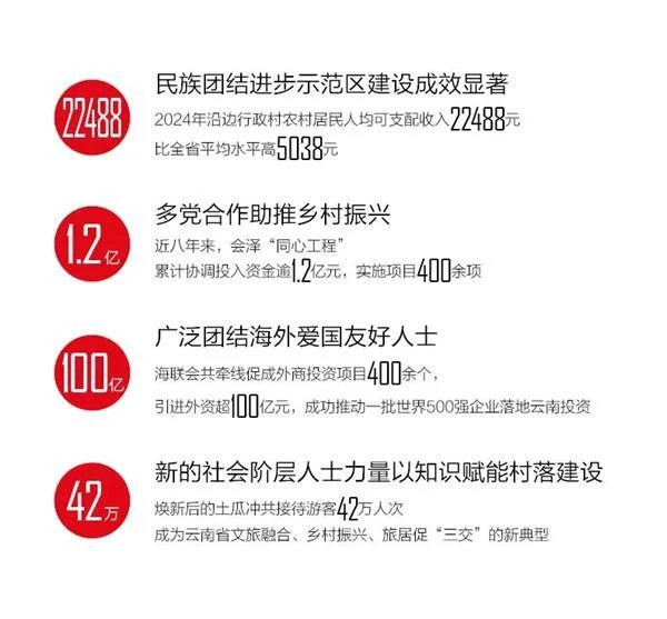 “十四五”以来,云南省充分发挥统一战线法宝作用,在云岭大地书写了服务高质量发展的生动篇章。从乌蒙山乡“同心工程”的多年深耕,到374个边境幸福村全面建成;从多党合作助力产业振兴、教育提质,到新的社会阶层人士激活“空心村”变身“旅居村”;从“万企兴万村”行动累计投资超460亿元,到海外联谊会持续架桥引智……五年来,云南统一战线聚焦中心、凝心聚力,在促进民族团结、助力乡村振兴、服务对外开放、筑牢生态屏障等方面结出累累硕果,展现了新时代统战工作的独特优势与蓬勃生机,为谱写中国式现代化云南篇章汇聚起磅礴力量。